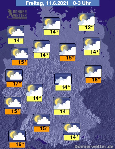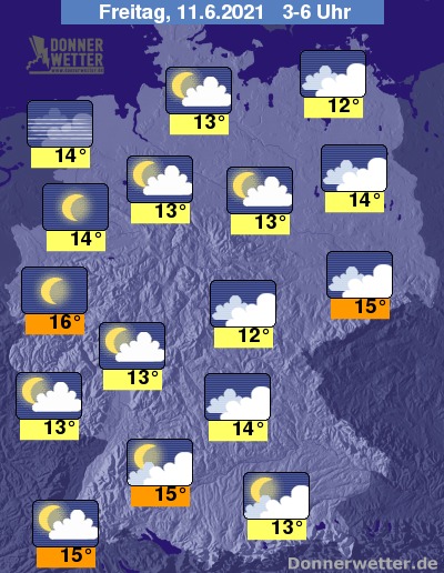 In der Nacht überwiegt in der Westhälfte Deutschlands lockere Bewölkung, im Nordwesten kann es in den frühen Morgenstunden auch aufklaren. Im Süden und Osten ist der Himmel meist wechselnd oder stark bewölkt.