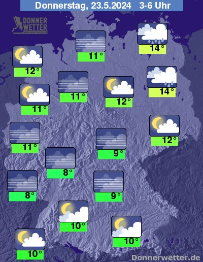 Die Temperaturen gehen in den Frühstunden zurück auf Werte um 14 bis 8 Grad.