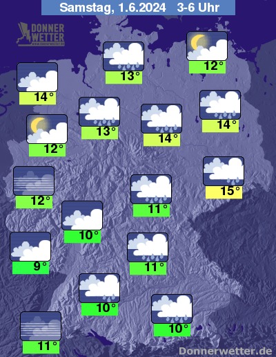 In der Nacht auf Samstag bleibt es im Norden und Westen bei wechselnder bis starker Bewölkung weitgehend niederschlagsfrei, im Süden und Südosten setzt sich ergiebiger Dauerregen fort. Vorsicht Unwettergefahr!