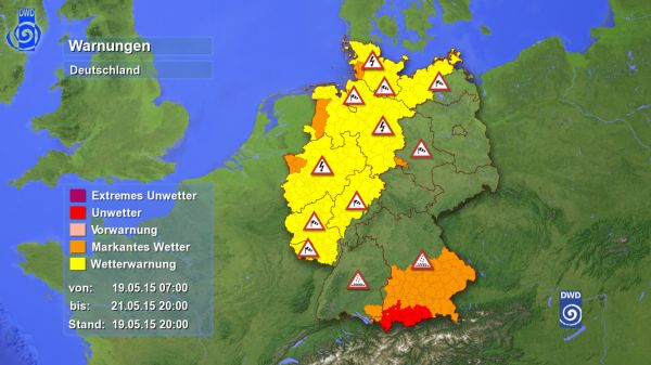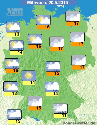 Am Mittwoch bleibt es vom Süden Deutschlands, über die Mitte bis in den Osten und Nordosten verbreitet stark bewölkt oder bedeckt, dabei fällt im Süden oft langanhaltender und am Alpenrand auch ergiebiger Regen, sonst ist es zunächst trocken und am Nachmittag können sich einzelne Schauer bilden. Im Westen und Norden der Republik ist es hingegen zunächst meist heiter bis sonnig und trocken, im Tagesverlauf ziehen jedoch teils dichte Wolken mit Schauern und möglichen Gewittern auf. Die Temperatur steigt auf kühle 11 Grad im Raum München und bis etwa 17 Grad in Berlin.
