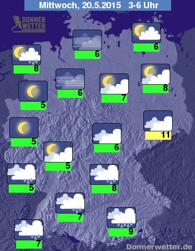 In der Mitte und im Osten des Landes bleibt es weitgehend stark bewölkt, aber trocken. Im Norden und Westen ist es zunächst oft locker bis aufgelockert bewölkt, im weiteren Verlauf dann meist sternenklar und ebenfalls trocken. Die Temperatur sinkt auf 11 Grad in Görlitz und bis 5 Grad im Siegerland.