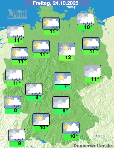 Am Freitag zieht oft starke Bewölkung durch, besonders am Nachmittag ist es aber auch vielerorts wechselnd oder aufgelockert bewölkt. Es können sich aber den ganzen Tag über gebietsweise Schauer bilden. Die Temperatur steigt auf 7 Grad in Jena und bis 12 Grad in Magdeburg. Vor allem über dem Norden weht der Wind oft stürmisch, sonst meist mäßig bis stark.