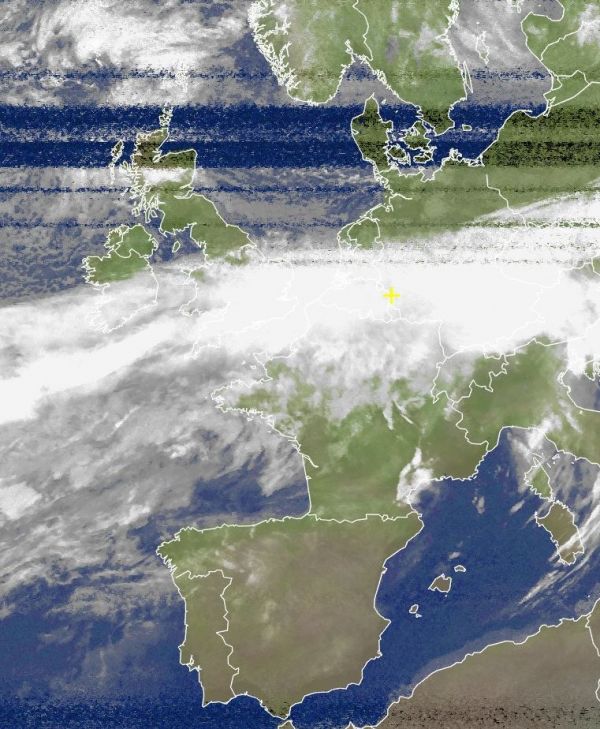 Das Satellitenfoto von heute Morgen zeigt ein kräftiges Wolkenband, das von Irland, über das südliche England, den Norden Frankreichs, Benelux, über die Südhälfte der Bundesrepublik und weiter nach Osteuropa reicht und in den Regionen für verbreitet nasskaltes und teils windiges Wetter sorgt.