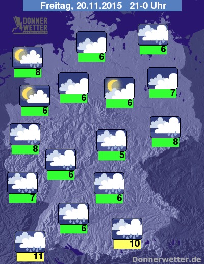 In der Nacht zum Samstag bleibt es sowohl im Süden als auch im Nordosten Deutschlands bei weitgehend dichter Bewölkung, dazu fällt hier zeitweise Regen, örtlich ist auch Schneeregen möglich. Im übrigen Bundesgebiet ist es teils klar, zum Teil ziehen aber auch dichte Wolken durch und es können sich einzelne, hier und da auch mit Schnee vermischte Schauer bilden. Die Temperatur sinkt auf 6 Grad in Ostfriesland und bis 2 Grad am Westerwald.