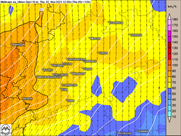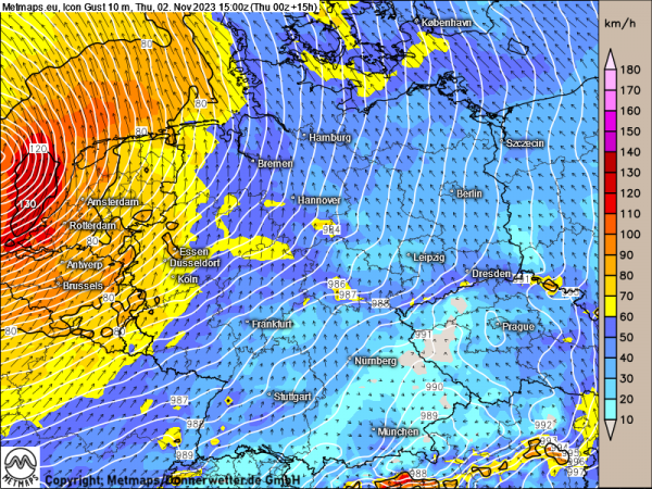 Spitzenwindböen 10m (15:00 Uhr, 02.11.2023)