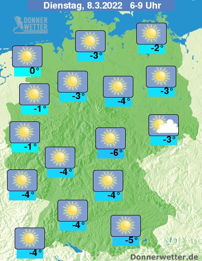 Der Dienstag startet verbreitet heiter oder die Sonne scheint von einem wolkenlosen Himmel. Es bleibt trocken. Die Temperaturen erreichen in den Frühstunden frostige -6 bis 0 Grad.