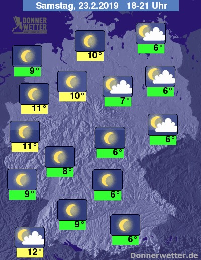 Heute Abend ist der Himmel überwiegend sternenklar, vor allem im Osten und Nordosten ziehen auch einige lockere Wolken durch, dazu bleibt es überall trocken. Die Temperatur sinkt auf 12 Grad im Breisgau und etwa 6 Grad in der Lausitz.
