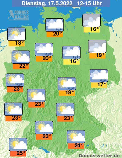 Heute Nachmittag zeigt sich der Süden verbreitet heiter oder wechselnd bewölkt und trocken. Vor allem im Norden und Osten ist es stark bewölkt und es bilden sich gebietsweise Schauer. Im übrigen Land ist es oft heiter, teils stärker bewölkt bei nur seltenen Schauern. Die Temperatur liegt bei 16 Grad an der Ostsee und rund 25 Grad im Breisgau.