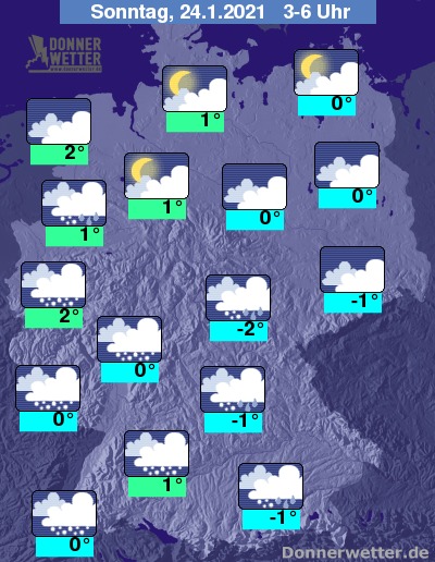 In der kommenden Nacht zieht von Südwesten her Schneefall, zum Teil auch Schneeregen auf, der sich bis zum Morgen etwa auf die gesamte Südwesthälfte der Bundesrepublik hin ausbreitet. Weiter nach Nordosten hin ist es zwar meist stark, hin und wieder etwas aufgelockert bewölkt, jedoch bleibt es hier trocken. Die Temperatur sinkt auf 2 Grad am Niederrhein und bis -2 Grad im Thüringer Becken.