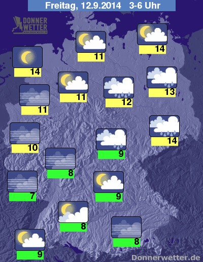In der Nacht zum Freitag bildet sich im Süden zunächst noch einzelne Schauer, selten sind auch Gewitter möglich, hier klingen die Niederschläge aber nach Mitternacht meist ab, im Osten halten sich die dichten Wolken dagegen verbreitet bis zum Morgen und es fällt gebietsweise Regen. Locker bewölkt oder klar bleibt es im Norden und Westen des Landes, stellenweise bildet sich hier jedoch Nebel oder Hochnebel. Die Temperatur sinkt auf 14 Grad in der Lausitz und 7 Grad im Saargau.