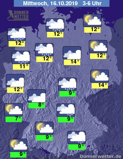 In der kommen Nacht ist es im Osten und Südwesten meist locker bewölkt und trocken. Sonst ist es meist bedeckt. Gerade im Norden und Südosten bringt der bedeckter Himmel viele Schauer, zeitweise auch Regen mit sich. Die Temperaturen fallen auf 11 Grad um Dortmund und 8 Grad um Franfurt a. M.