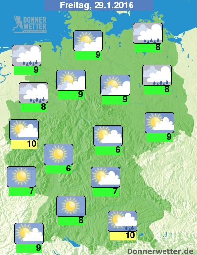 Heute halten sich im Norden überwiegend dichte Wolken und es fällt auch zeitweise Regen. Zu Tagesbeginn fällt auch am Alpenrand noch zeitweise Regen, in den übrigen Landesteilen ist es hingegen verbreitet heiter bis sonnig, zum Teil ziehen aber mal einige Wolken durch, dazu bleibt es trocken. Die Temperatur steigt auf 6 Grad in Oberfranken und bis 10 Grad im Rheinland. Im Norden ist es oft stürmisch, zum Teil herrscht hier Sturm.