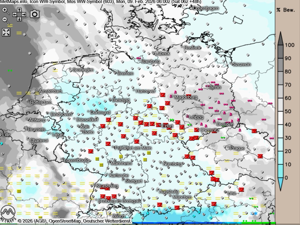 Die Temperatur- / Wetterkarte für Montagfrüh 05:00 / 06:00 Uhr nach ICON: