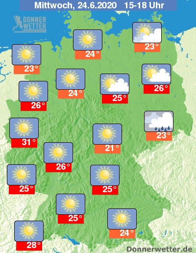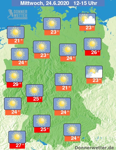 Die Temperaturen bewegen sich zwischen 21 Grad an den Küsten von Nord- und Ostsee, sowie in den Mittelgebirgen und nahe 30 Grad in der Kölner Bucht.