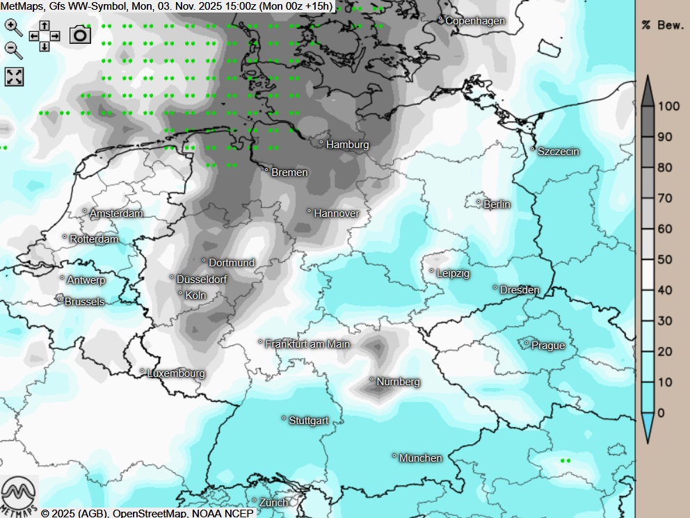 Am Montagnachmittag zeigt sich der Himmel über dem Norden und Nordwesten Deutschlands stark bewölkt und zeitweise fällt etwas Regen. In den übrigen Landesteilen überwiegt am Nachmittag heiteres Novemberwetter, vor allem im Süden scheint die Sonne auch von einem wolkenlosen Himmel - dabei bleibt es trocken.