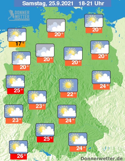 Heute Nachmittag halten sich über dem Norden mehrheitlich dichte Wolken, nur hier und da lockert es auch mal etwas auf. Weiter nach Süden hin herrscht hingegen verbreitet heiteres bis sonniges Spätsommerwetter. Es bleibt überall trocken bei Werten von 16 Grad an der Nordsee und etwa 25 Grad im Breisgau.