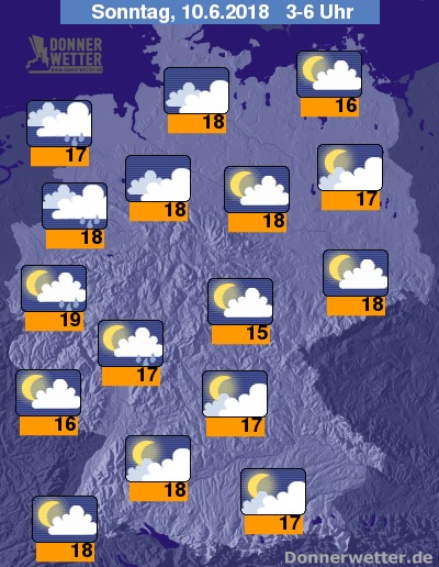 In der Nacht zum Sonntag bilden sich über NRW und Niedersachsen wiederholt, zum Teil kräftige Schauer und einzelne Gewitter, sonst ist es meist wechselnd, teils auch stärker bewölkt, aber weitgehend trocken. Die Temperatur sinkt auf 19 Grad in Düsseldorf und bis 15 Grad im Grabfeld.