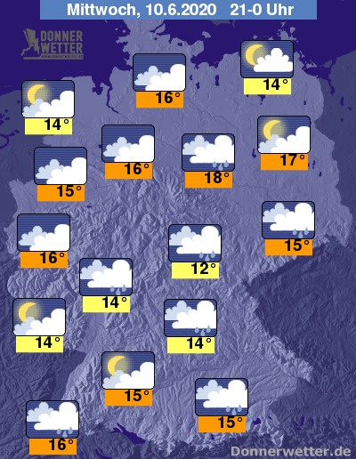 Auch während der zweiten Nachthälfte muss regional mit Regengüssen gerechnet werden. Sonst halten sich meistens die Wolken und lassen nur stellenweise Mond und Sterne zum Vorschein kommen.