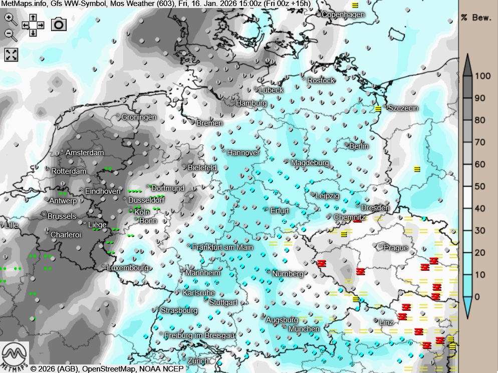 Die Temperatur- und Wetterkarte für Freitagnachmittag (15:00 Uhr) nach GFS: