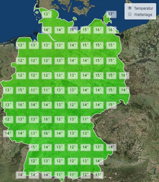 Die Temperaturen gehen dabei zurück auf Tiefstwerte um die 11 Grad am Alpenrand und auf vergleichsweise milde 17 Grad auf Rügen.