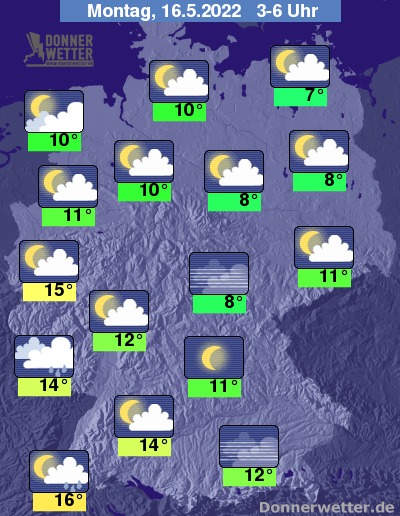 In der Nacht zum Montag zeigt sich der Himmel überwiegend gering bis locker bewölkt, zum Morgen hin ist es auch zunehmend wechselnd bewölkt. Im Südwesten sind anfangs schon oft dichte Wolken unterwegs, die im Nachtverlauf weiter zunehmen, hier bilden sich in der zweiten Nachthälfte gebietsweise Schauer, sonst bleibt es aber trocken. Die Temperatur sinkt auf 16 Grad in Freiburg und 7 Grad in Neubrandenburg.