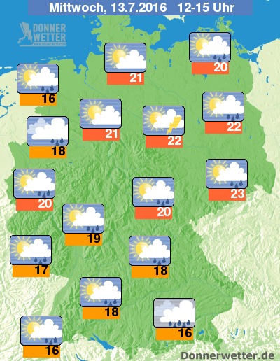 Heute Nachmittag fällt im Alpenvorland unter meist dichten Wolken immer wieder, teils auch langanhaltender Regen. Weiter nach Norden hin zeigen sich teils heitere Abschnitte, jedoch können auch hier immer wieder dichte Wolken durchziehen, dazu bilden sich gebietsweise Schauer und auch mögliche Gewitter. Die Temperatur liegt bei kühlen 16 Grad in München und schwülwarmen 23 Grad im Raum Leipzig.