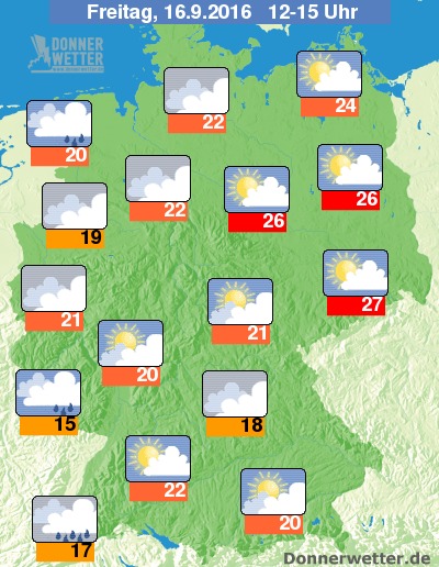 Heute Abend ist es im Norden und Osten, sowie im Alpenvorland überwiegend stark bewölkt, dazu bilden sich zeitweise Schauer und es sind auch Gewitter möglich. In den übrigen Landesteilen ist es teils stark bewölkt, hier und da zeigen sich jedoch auch heitere Abschnitte, dabei bleibt es meist trocken. Die Temperatur liegt bei 16 Grad am Pfälzer Wald und etwa 27 Grad in Dresden.