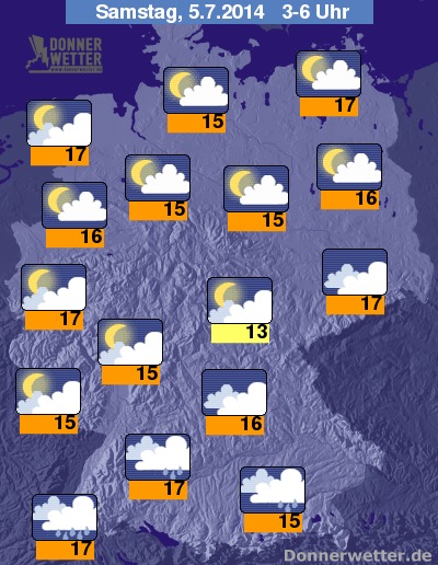 In der kommenden Nacht schauert und gewittert es im Süden unter vielfach dichten Wolken weiter, sonst zieht überwiegend aufgelockerte, gebietsweise auch starke Bewölkung durch, wobei es allerdings weitgehend trocken bleibt. Die Tiefstwerte sinken auf recht einheitliche Werte zwischen 17 und 13 Grad.