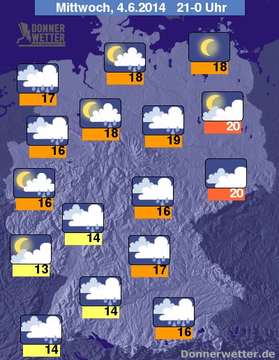 Am Abend ziehen die dichten Wolken mit Regen weiter ostwärts. Die Temperatur sinken dabei auf Werte von 20 bis 13 Grad.