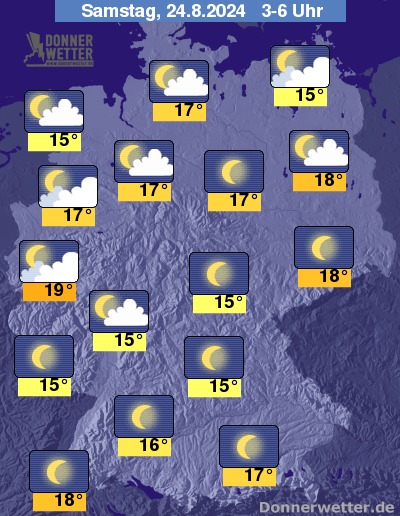 In der Nacht zum Samstag bleibt der Himmel über der Nord- und Westhälfte wechselnd oder stark bewölkt, Niederschläge sind aber die Ausnahme. In den südlichen Landesteilen ist es gering bewölkt oder sternenklar und es bleibt niederschlagsfrei.