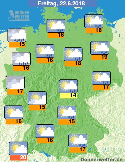 Über dem Süden und Südwesten scheint gebietsweise für längere Zeit die Sonne. Sonst gibt es eine rasche Mischung aus kurzen sonnigen Phasen und mächtigeren Wolkenmassen. Dabei muss mit Schauern und örtlichen Gewittern gerechnet werden. Die Höchsttemperaturen erreichen nur noch 14 bis 22 Grad. Der Wind frischt gebietsweise spürbar auf und kommt aus Nordwest.