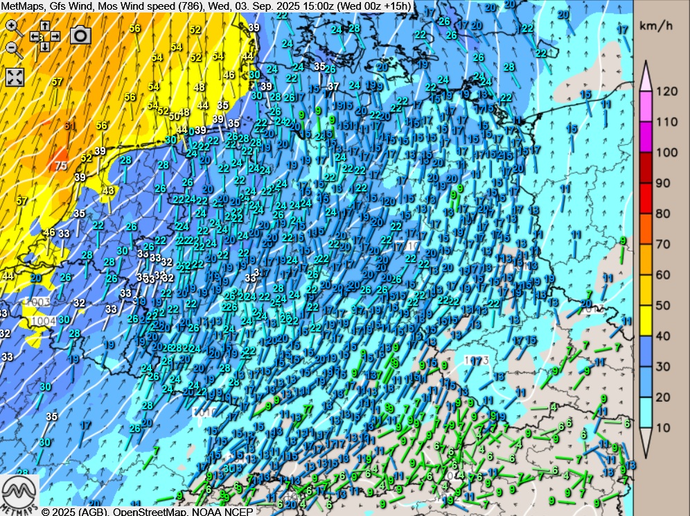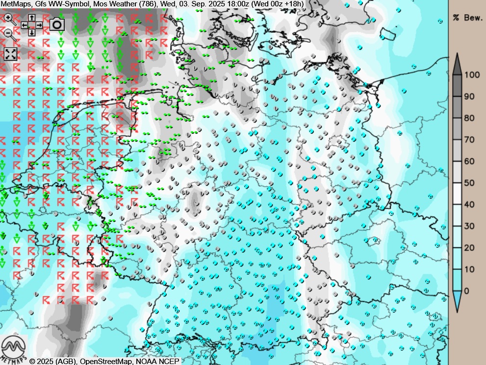 Die Böenkarte für Mittwochnachmittag nach GFS sowie die Wetterkarte mit lokalen Gewittern im Westen und Nordwesten für den Mittwochabend (18:00 Uhr):