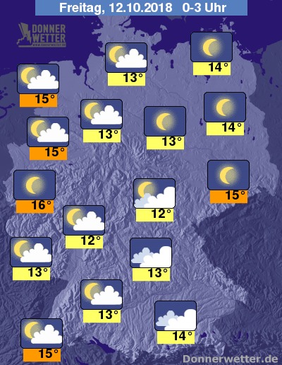 In der Nacht zeigt sich der Himmel vor allem entlang der Oder sowie regional in der Nordwesthälfte häufig sternenklar, in den übrigen Landesteilen überwiegt lockere oder aufgelockerte Bewölkung. Es bleibt meist trocken, einzelne Schauer sind im Nachtverlauf allein am Oberrhein möglich.