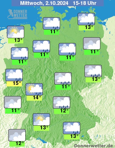 Am Mittwochnachmittag zeigt sich der Himmel verbreitet wechselnd bis stark bewölkt, Auflockerungen sind vor allem im Südwesten und an der Nordseeküste möglich. Hier bleibt es auch meist trocken, sonst  fällt am Alpenrand sowie im Südosten zeitweise Regen, auch in den übrigen Landesteilen muss am Nachmittag zeitweise mit Schauern gerechnet werden.