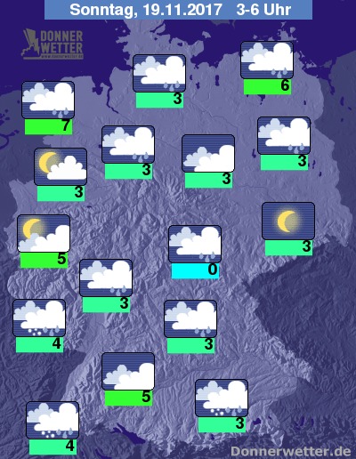 In der folgenden Nacht zieht ein Tiefausläufer mit dichten Wolken und Regen, Schneeregen, Graupel und Schnee in den Süden Deutschlands, während ein neuer Ausläufer von Norden das Land erreicht. Es bilden sich gebietsweise, teils kräftige Schauer. Die Temperatur sinkt auf 7 Grad in Emden und bis 0 Grad im Grabfeld. An der Nordsee herrscht teils Sturm, an der Ostsee weht ein starker und teils stürmischer Wind.