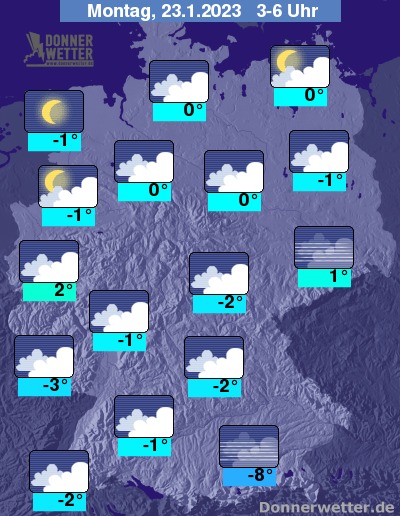 Am Montag ist es überwiegend stark bewölkt bis bedeckt, im Norden ist es vielerorts auch heiter bis sonnig. Im Süden fällt gelegentlich etwas Schnee, während es im übrigen Bundesgebiet weitgehend trocken bleibt. Die Temperatur steigt auf -1 Grad in Erfurt und bis 4 Grad in der Kölner Bucht.