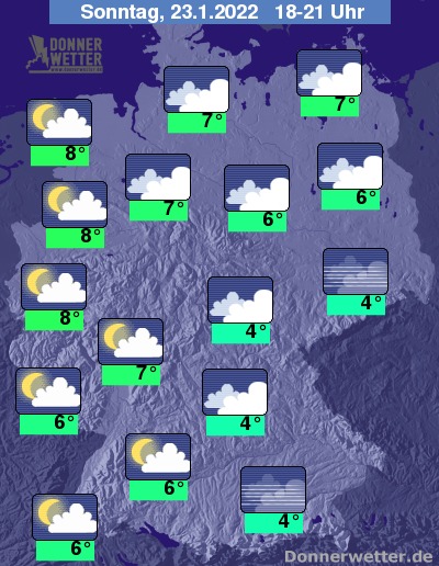 Heute Abend lockert der Himmel über den westlichen Landesteilen verbreitet auf. Weiter nach Osten hin bleibt es dagegen meist bedeckt und gebietsweise ist es auch neblig-trüb, jedoch bleibt es überall trocken. Die Temperatur liegt bei 4 Grad in Dresden und bis 8 Grad in Köln.