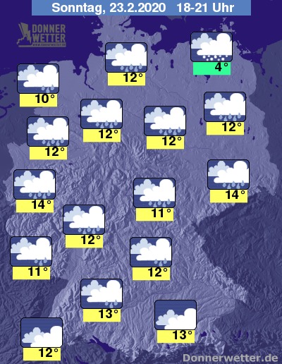 Heute Abend bleibt es bei dichter Bewölkung und es fällt häufig Regen, im Ostseeumfeld örtlich auch Schneeregen oder Schnee. Die Temperatur liegt bei 4 Grad in Stralsund und bis zu 14 Grad in Köln. Im Norden und Westen lässt der anfangs oft noch stürmische Wind langsam nach, im Osten und Teilen Süddeutschlands weht er dagegen den ganzen Abend verbreitet stürmisch mit zum Teil schweren Sturmböen.