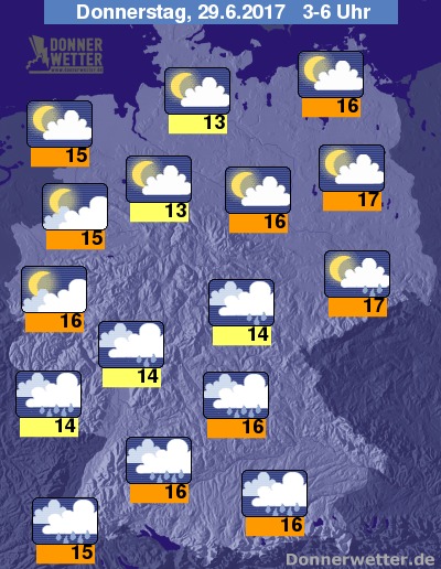 In der Nacht zum Donnerstag ist der Himmel über der Nordhälfte Deutschlands meist locker oder aufgelockert bewölkt und weitgehend trocken, weiter nach Süden hin bleibt die Wolkendecke hingegen verschlossen und besonders über Baden-Württemberg und Bayern fällt verbreitet langanhaltender und zum Teil noch gewittriger Regen. Die Temperatur sinkt auf 17 Grad in Berlin und bis 13 Grad an der Weser.