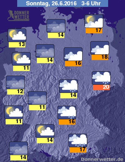 In der Nacht zum Sonntag ist es anfangs verbreitet stark und nur gelegentlich aufgelockert bewölkt, dabei bilden sich immer wieder auch Schauer und örtliche Gewitter. Von Südwesten her lockert der Himmel im Nachtverlauf jedoch immer weiter auf, gegen Morgen ist es über der Südwesthälfte Deutschlands bereits meist locker bewölkt oder sternenklar und dazu trocken. Besonders im Osten und Südosten fällt bei meist dichten Wolken jedoch zeitweise Regen. Die Temperatur sinkt auf 20 Grad in Görlitz und etwa 11 Grad am Niederrhein.