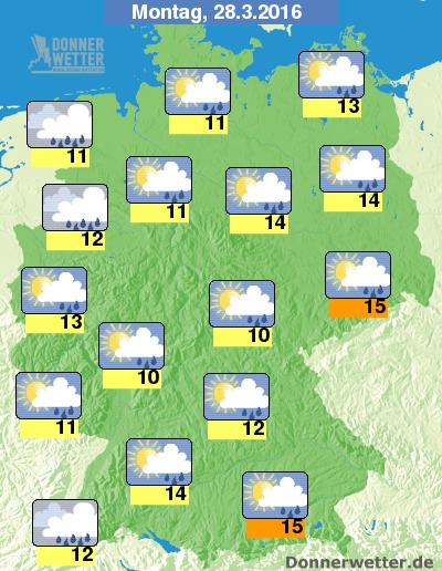Am Ostermontag bleibt es nach Osten hin zunächst noch oft aufgelockert, zum Teil ist es aber auch schon stark bewölkt, dazu bleibt es noch trocken, im übrigen Bundesgebiet ziehen aus Westen meist dichte Wolken durch und es fällt häufiger, teils auch kräftiger Regen. Am Nachmittag bilden sich über der Westhälfte wiederholt Schauer und regional auch kurze Gewitter. Es werden 10 bis 15 Grad erreicht, zudem weht im Westen und Norden ein teils stürmischer Wind.