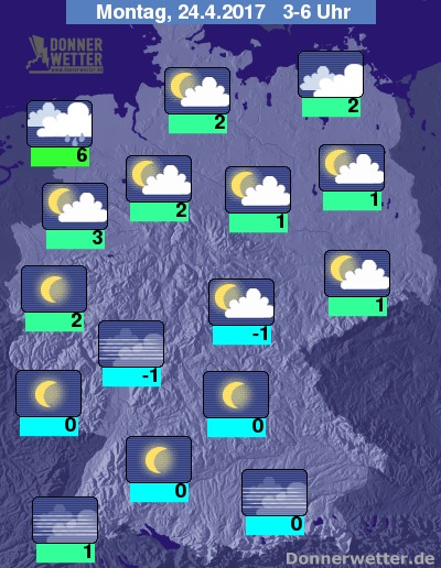 In der bevorstehenden Nacht sind im Küstenumfeld teils dichte Wolken und etwas Regen möglich. Besonders über der Südhälfte Deutschlands ist es hingegen sternenklar und auch sonst meist nur leicht bewölkt, dazu bleibt es trocken. Die Temperatur sinkt auf 6 Grad in Emden und bis auf -1 Grad in Oberfranken.