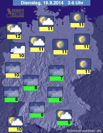 In der Nacht zum Dienstag bleibt es mehrheitlich klar, dabei bildet sich stellenweise Nebel oder Hochnebel, aber es bleibt weitgehend trocken. Dichtere Wolken halten sich zum Teil in Schleswig-Holstein und im Nordseeumfeld, hier sind einzelne Schauer möglich. Die Temperatur sinkt auf 12 Grad in Ostfriesland und 7 Grad im Thüringer Wald.