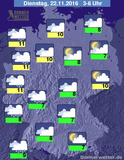In der folgenden Nacht ziehen dichte Regenwolken über einen breiten Streifen vom Schwarzwald, über den Südwesten, Westen des Landes bis über das westliche Niedersachsen hinweg. Meist stark bewölkt bleibt es auch östlich anschließend dieses Streifens, hier jedoch trocken. Einige Auflockerungen zeigen sich vom Südosten bis in den Osten der Republik, dazu ist es hier ebenso trocken. Die Temperatur sinkt auf 11 bis 7 Grad.