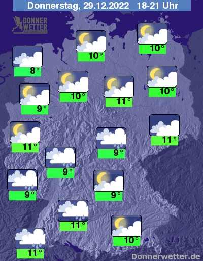 Heute Abend ist der Himmel über der Nordhälfte Deutschland teils stark, teils aufgelockert bewölkt, dazu bleibt es bis auf seltene Schauer trocken. Vom Südwesten des Landes bis in den Norden Bayerns und nach Thüringen fällt unter dichten Wolken verbreitet Regen. Im Südosten ist es wiederum meist trocken. Die Temperatur liegt bei 8 Grad in Wilhelmshaven und 11 Grad in Freiburg. Der Wind weht im Norden und Westen noch oft stark und teils stürmisch, an der Nordsee herrscht zum Teil Sturm.
