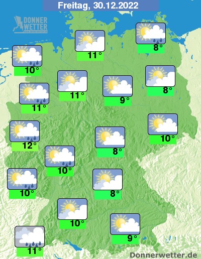 Am Freitag scheint vor allem nach Osten hin häufig die Sonne bei dort meist nur lockeren Wolken. Weiter nach Westen ist es jedoch schon oft stark bis dicht bewölkt und im Laufe des Tages setzt aus Westen her Regen ein, der bis zum Abend bis in die Mitte Deutschlands vorankommt. Die Temperatur steigt auf 8 Grad in Berlin und 12 Grad in Köln. Von Westen her weht zunehmend starker bis stürmischer Wind, in Böen sind im Verlauf verbreitet Sturmböen möglich. An der Nordsee herrscht oft schwerer Sturm.