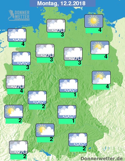 Bei einem Mix aus Sonne und Wolken treten gebietsweise Schnee- Schneeregen- und Graupelschauer auf. Vereinzelt kann es dabei auch mal blitzen und donnern. Außerdem besteht Glättegefahr. Bis zum Abend klingen die Schauer allmählich ab und der Himmel klart größtenteils auf. Bei einem etwas böigen Westwind liegen die Tagestemperaturen meist zwischen 0 und 6 Grad. In der Nacht auf Dienstag muss verbreitet mit leichtem bis mäßigem, in einigen Alpentälern auch strengem Frost gerechnet werden.