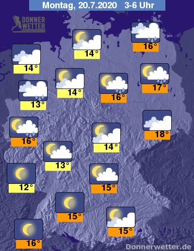 In der Nacht zum Montag bilden sich vor allem im Osten und Nordosten, anfangs auch im Süden und sonst nur vereinzelt Schauer. Im Südwesten ist es häufig sternenklar, sonst jedoch meist wechselnd bis stark bewölkt. Die Temperatur sinkt auf 18 Grad in Dresden und bis 12 Grad im Saargau.