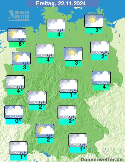 Am Freitag ist es meist wechselnd oder stark bewölkt und es muss verbreitet mit Regen-, Schneeregen- oder Schneeschauern gerechnet werden. Es weht ein mäßiger bis frischer, in Böen auch starker Wind.