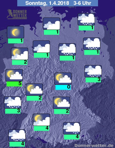 In der Nacht zum Sonntag fällt im Norden und Osten unter dichten Wolken wiederholt Regen, Schneeregen oder Schnee, dabei kann es teils gefährlich glatt auf den Straßen werden! Im Südwesten ziehen neue dichte Wolken auf, die hier gebietsweise Schnee oder Schneeregen bringen, sonst ist es teils stark, teils aufgelockert bewölkt und trocken. Die Temperatur sinkt auf 6 bis 0 Grad.